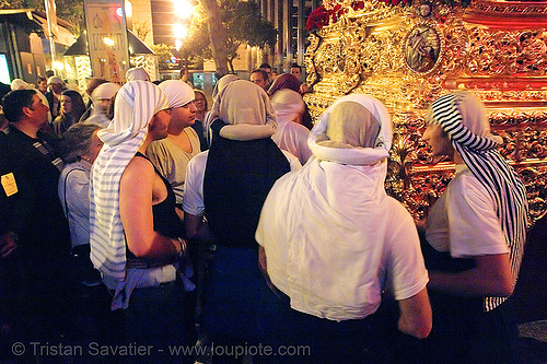 Costaleros go under the paso and carry its weight on the back of their neck, which is why they wear that particular headdress (called "costal"). Each Costalero carries between 50 Kg and 70 Kg (about 100 lb) and they frequently switch teams. Each paso (float) weights 1 Ton or more, so they need about 20 to 40 Costaleros to carry it.