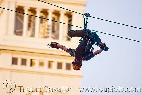 People riding the free zip-line installed by the British Columbia Tourism Bureau over Justin Herman Plaza near the Embarcadero center in San Francisco.