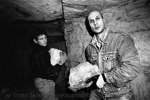 Urban Caver Olrik Writing on Concrete Wall of a Utility Tunnel with a Carbide Lamp (Paris)